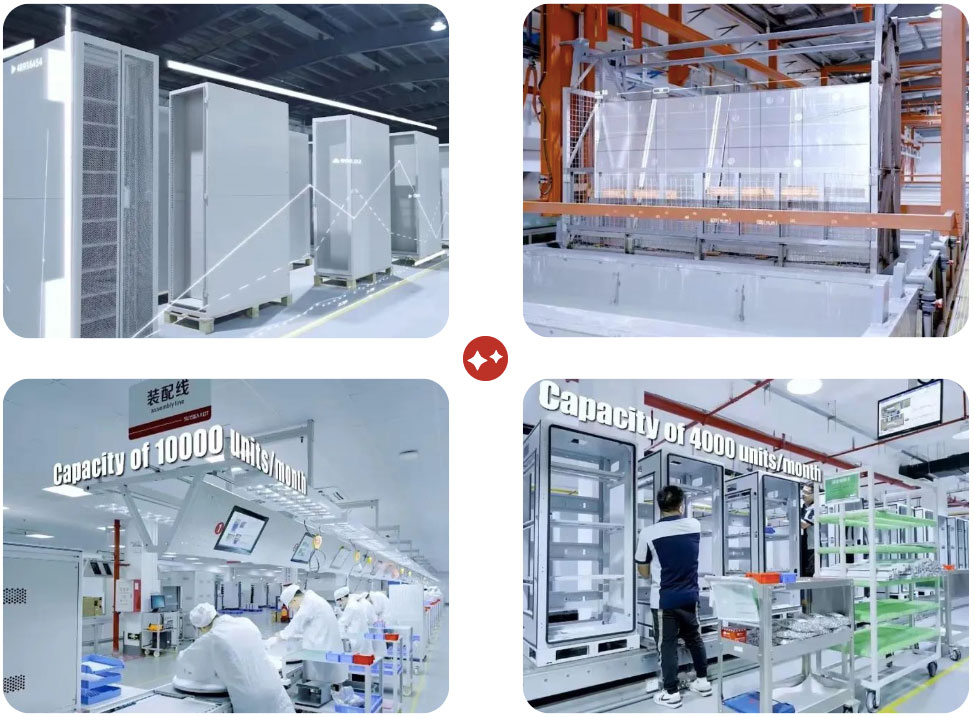 集成車間引進了戶外柜生產(chǎn)線,產(chǎn)能平均高達4000臺/月)。采用電子看板,可實時顯示工序SOP,設有淋水防護測試、性能測試,掃碼系統(tǒng),并單獨設立了嵌入式電源ATE測試工位,可實現(xiàn)電源的自動檢測和數(shù)據(jù)記錄。同時引進了微站電池生產(chǎn)線,產(chǎn)能高達10000臺/月),采用電子看板,設有耐壓測試、氣密測試,并單獨設立了ATE測試、充放電老化測試工位,進行嚴格、專業(yè)的安全、性能及可靠性測試。